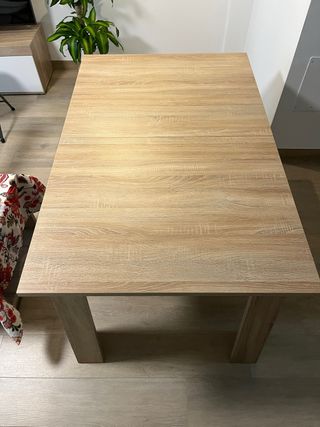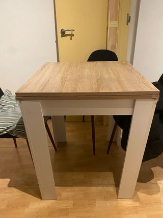 140 x 90 x 78 (plegada) Cada silla a 15€ y la mesa 80€ Si te llevas las cuatro sillas 50€ Conjunto de mesa extensible con sillas. Ideal para comedor o cocina. - Mesa con acabado en madera clara. - Sillas a juego.