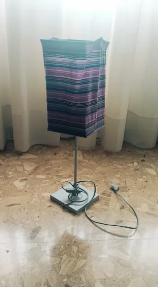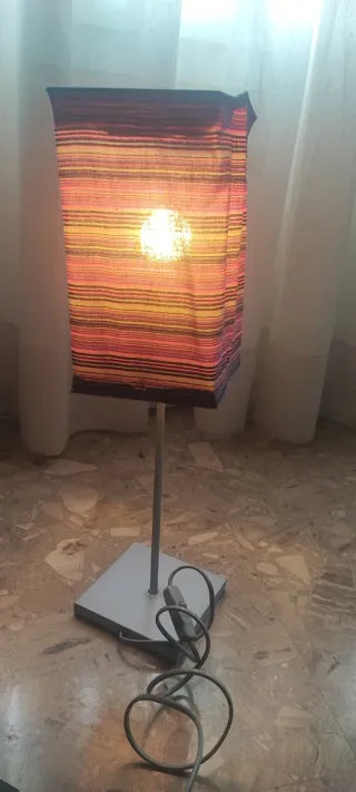 Lámpara de mesa con un diseño moderno y original. - Pantalla de tela con estampado de rayas horizontales. - Base y pie de metal. - Cable de plástico con enchufe. -soporte de plástico
