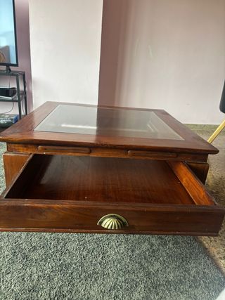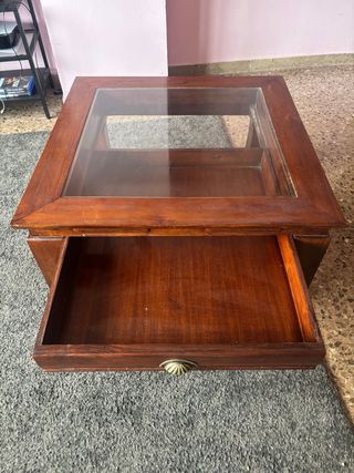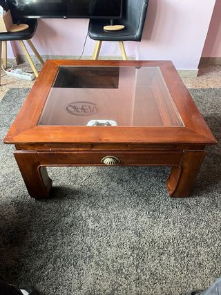 Elegante mesa de centro con un diseño clásico y funcional. Combina la calidez de la madera con la transparencia del cristal para adaptarse a cualquier salón. - Estructura de madera robusta. - Superficie de cristal. - Un cajón con tirador decorativo.