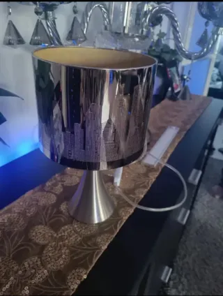 Elegante lámpara de mesa con un diseño moderno que evoca un paisaje urbano. - Pantalla metálica con silueta de rascacielos. - Base cónica de metal pulido. - Acabado brillante y reflectante.