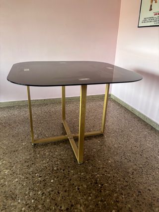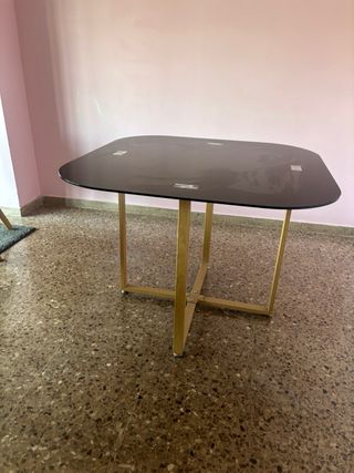Elegante mesa con sobre de cristal negro y base metálica dorada. Su diseño moderno se adapta a diversos espacios. - Sobresaliente superficie de cristal. - Patas metálicas con acabado dorado.