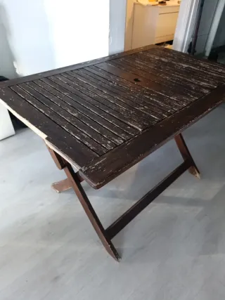 Mesa de madera con un diseño rústico y desgastado. Su estructura de madera le da un toque natural y auténtico. - Tablero con lamas de madera. - Agujero central para sombrilla.