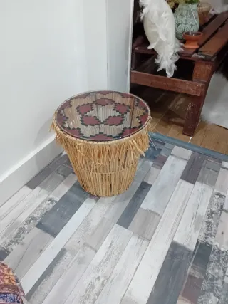 Mesa auxiliar con un diseño único y materiales naturales. - Estructura de bambú y mimbre. - Tapa de cristal con un patrón decorativo. - Flecos de fibra natural en el borde.