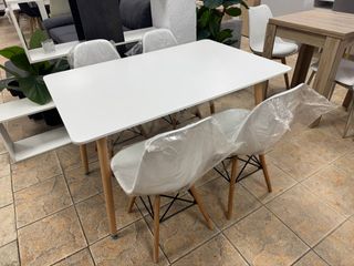 Mesa de diseño escandinavo con capacidad para cuatro comensales. Tapa blanca de alta calidad y patas de madera clara natural, ofreciendo gran estabilidad. Incluye cuatro sillas nórdicas a juego, muy cómodas y fáciles de limpiar. Se entrega completamente nuevo en su embalaje original. Perfecto para añadir un toque hygge a tu hogar. 📲 639*116*436 - Judith ☎️ ✅Pagos y envios a contra - rembolso ✅ ✅Envios de 1 a 4 dias. ✅ ✅Envio de factura. ✅ ✅Garantia de 2 años.✅ ✅Productos completamente Nuevos ✅ ☎️ Tienes dudas? , no dudes en comunicarte con nosotros, atendemos 24HRS.☎️