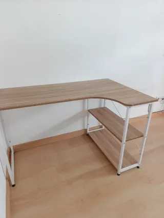 Mesa de esquina con un diseño moderno y funcional. - Tablero de madera con acabado en tono natural. - Estructura de metal blanco. - Cuenta con dos baldas inferiores para almacenamiento. Sufrió un golpe en una mudanza y tuve que pulir un costado, se puede ver en la última foto, de ahí el precio tan económico. Si pones ese costado justo donde va la pared o otro mueble, se disimula mejor. Las medidas exactas son: - 120 ancho - 47 fondo + 73 la parte que sobresale más - 72 altura