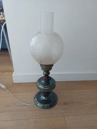 Elegante lámpara de mesa con un diseño único. - Base de cerámica con acabado en color verde azulado. - Globo de cristal con un delicado grabado. - Detalles en color burdeos.