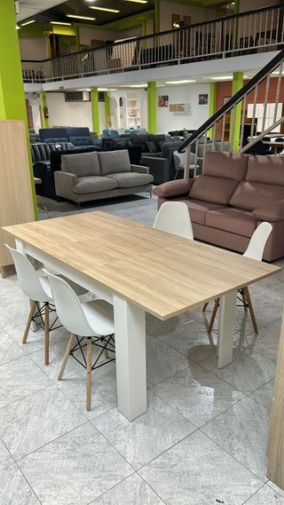 ☎️ 680*558*196 💲 Precios: Mesa + 4 sillas: 146€ Solo mesa: 90 € Mesa de comedor extensible NUEVA, moderna y extensible, en acabado roble claro con estructura en blanco. Perfecta para salón o cocina. Disponible con 6 sillas o solo la mesa. ✔ Características: Mesa de comedor extensible Acabado madera roble claro Diseño moderno y estable Apertura cómoda y resistente 📐 Medidas: Largo: 138 cm (cerrada) – 178 cm (abierta) Ancho: 80 cm Alto: 79 cm
