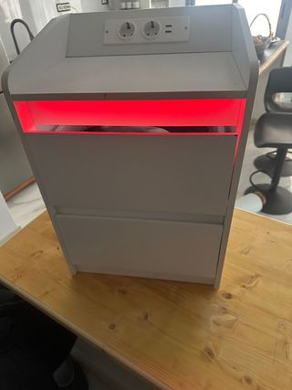 Mesa auxiliar de diseño moderno con iluminación LED integrada. Perfecta para añadir un toque contemporáneo a tu espacio. - Estructura principal en madera. - Panel de control con mando a distancia para las luces. - Incorpora enchufes y puertos USB en la parte superior.las medidas en los fotos