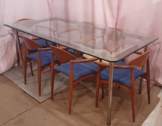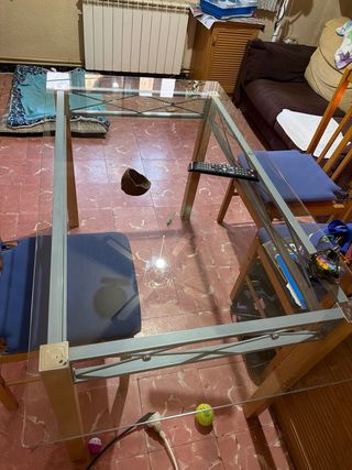 Conjunto de mesa con superficie de cristal y 6 sillas. - Estructura de metal. - 6 sillas de madera, bien cómodas. Todo en buen estado. Medidas de la mesa: 2m de largo, 1m de ancho, 83cm de alto.