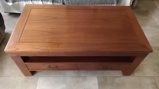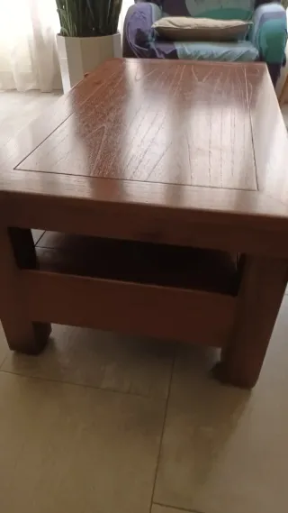 Mesa de centro robusta y elegante, fabricada en madera maciza. - Diseño contemporáneo con líneas limpias. - Acabado natural que resalta la veta de la madera. - Se puede elevar y tiene 2 cajones -Mide 110cm de largo× 60cm de ancho× 46cm de alto - Elevada mide 59cm.