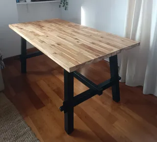 Mesa de comedor SKOGSTA de IKEA con tablero de madera y patas de madera. - Medidas: 160cm (largo) x 81cm (ancho) x 74cm (alto). - Diseño moderno y robusto. - En buen estado. - Como se puede ver en las fotos: En la madera de la mesa, hay algunas marcas simbólicas. Y en las patas, también. Cualquier duda, listo para ayudarte. Precio negociable. Mejor Recogida que envio.