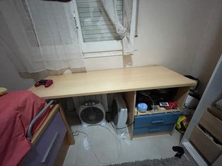 Mesa de habitación con un diseño moderno. PRECIO NEGOCIABLE - Superficie de madera clara. - Patas y detalles en color azul.