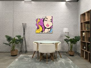 Elegante mesa con sobre de cristal y estructura metálica. - Diseño moderno con motivos gráficos. - Patas metálicas resistentes.