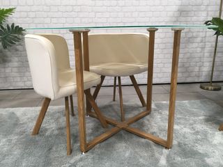 Elegante mesa de comedor con superficie de cristal templado y base de madera. - Diseño moderno y minimalista. - Patas de madera robustas soldadas a láser. - Tablero de cristal transparente templado de 1 cm.