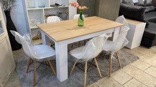 Mesa de comedor con un diseño moderno y resistente, ideal para hasta 6 personas. - Tablero muy resistente a manchas y golpes. - Patas de madera robustas. Precio de compra en 2021 (199.00€)