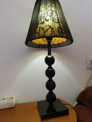 Elegante lámpara de mesa con un diseño clásico y acabado en madera oscura. Su pantalla de tela aporta una luz cálida y acogedora. - Pantalla cónica de tela. - Base y pie de madera torneada. - Cable de alimentación incluido.
