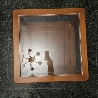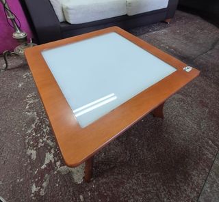 Mesa de centro hecha de madera Superficie de cristal Con espacio de allmacenamiento en la parte baja MEDIDAS: Ancho: 60 cm Largo: 60 cm Alto: 40 cm Y POR UN COSTE ADICIONAL ¡TE LO LLEVAMOS A CASA
