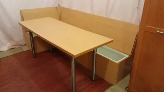 Conjunto de mesa y banco rinconero de madera clara. Ideal para espacios pequeños. - Mesa rectangular con patas metálicas. - Banco integrado a la mesa. - Diseño compacto y funcional. - Perfecto estado. Medidas de la mesa: 170x69cm Medidas del banco: 1,06x2,24m. 51cm de fondo.
