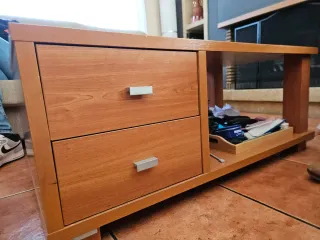 Mesa auxiliar de salón con un diseño moderno y funcional. Perfecta para complementar tu espacio. - Cuatro cajones con tiradores metálicos. - Compartimento abierto con bandeja. - Acabado en madera de cerezo. 1m largo x 55 ancho y 40 de alto. En buen estado, es madera maciza