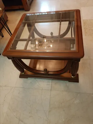 Elegante mesa de centro cuadrada (1m x 1m) con estructura de madera maciza y superficie de cristal. Altura de 42.7cm - Diseño moderno y funcional. - Acabado en tono madera cálido. - Superficie de cristal transparente que permite ver la parte/decoración inferior. No hago envíos, a recoger en persona. Gracias