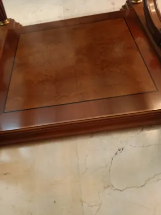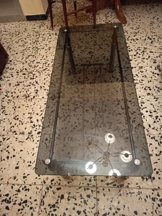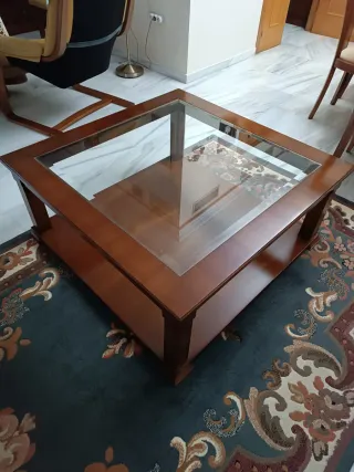 Elegante mesa de centro con un diseño moderno y funcional. Madera color nogal oscuro, tiene para baja para mesa de centro y pata alta para brasero con tarima y tapa de cristal. Se le.puede poner 2 cristales opacos en los huecos cuadrados, (no los tengo). - Merdidas 110 x 70 cm y altura mesa baja 47 cm - Superficie de cristal. - Patas de madera robustas. - Pata alta. - Pata baja. - Tarima de madera. Tengo la falda camilla a medida por 15 euros mas.