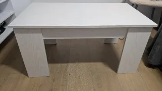 Mesa de centro elevable con un diseño moderno y funcional. Mesa de centro elevable de Leroy Merlín en perfecto estado. Menos de 3 meses de uso. Largo 50 ancho 90 alto 45 cerrada - 55 elevada - Acabado en madera con veta blanca. - Patas robustas y estables.