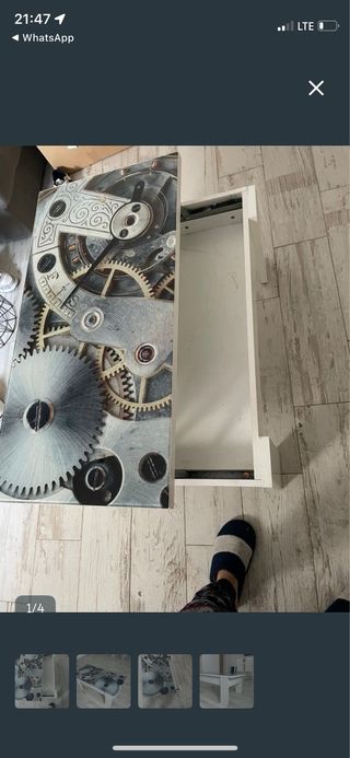 Mesa de centro con un diseño llamativo de engranajes. - Superficie con estampado de engranajes metálicos y detalles ornamentales. - Estructura blanca y plateada.