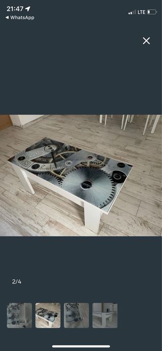Mesa de comedor extensible, y 4 sillas nuevas. La mesa es de 120cm x 90 cm, pero se extiende fácilmente a 220 cm, pudiendo pasar de 6 a 8/10 comensales en un momento. La estructura de de madera y tapa de cristal, muy robusta. Además, se incluyen 4 sillas nuevas. La mesa tiene un pequeño defecto en el tintado del cristal, pero que prácticamente no se aprecia. Ahora se cubre con cualquier adorno, como ves en la foto. Además, lleva una tapa de cristal templado de regalo. Solo el cristal ya vale una pasta. La vendemos por cambio de decoración, y está impecable. Mira además las estanterías de mi perfil, y te hago precio por todo.