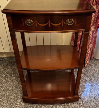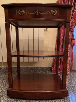 Elegante mesa auxiliar de madera con un diseño clásico. - Acabado en tono marrón oscuro. - Tres niveles de estanterías. - Detalle de ornamentación en el cajón superior.