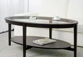 Elegante mesa de centro de IKEA con un diseño ovalado y moderno. Combina a la perfección la calidez de la madera con la transparencia del cristal. - Estructura de madera oscura. - Superficie de cristal. - Diseño ovalado. A recoger ,no se envía