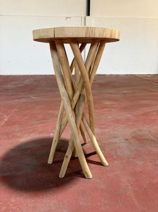 Mesa alta con un diseño único y natural, perfecta para añadir un toque rústico a tu espacio. - Tablero redondo de madera maciza. - Base con patas entrelazadas de ramas. - Acabado natural de la madera.