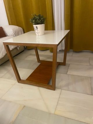 Mesa auxiliar con superficie de cristal y estructura de madera en acabado blanco. Sus medidas son 60 cm de largo y 56 cm de alto. - Combina cristal y madera.