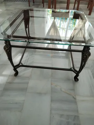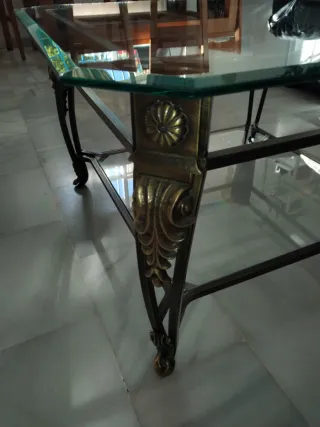 Elegante mesa de centro con superficie de cristal y estructura metálica. - Diseño moderno y sofisticado. - Patas con detalles ornamentales.