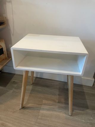Mesita de noche con un diseño moderno y funcional. - Acabado en blanco brillante. - Patas de madera de estilo nórdico. - Compartimento abierto para almacenamiento. Medida hueco compartimento 11,5 cm mismo fondo 30 cm Tiene marcas de uso tablero superior
