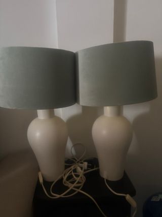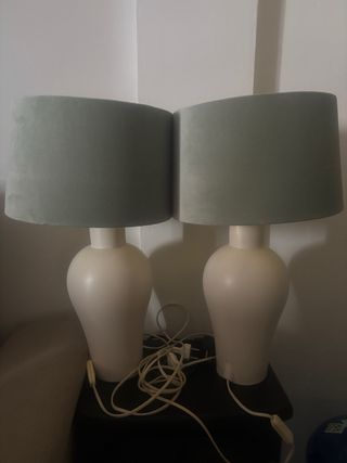 Elegante juego de dos lámparas de mesa con bases blancas y pantallas de terciopelo en tono verde menta. Perfectas para añadir un toque de estilo a cualquier habitación. - Bases de cerámica en color blanco. - Pantallas cilíndricas de terciopelo. - Diseño moderno y sofisticado.