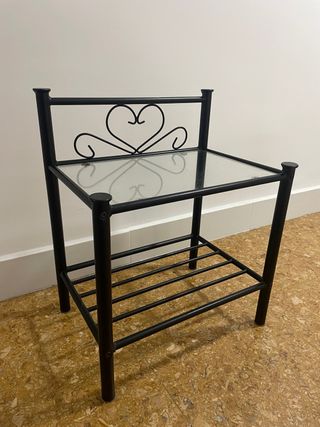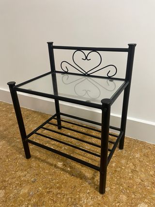 Elegante mesa auxiliar con un diseño moderno y un toque romántico. Dimensiones: 50x35, alto 61cm Ubicacion: Calle Alcantara, Las Lagunas de Mijas, 29649 - Estructura de metal resistente. - Encimera de vidrio. - Detalle decorativo en forma de corazón en la parte superior.
