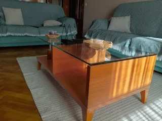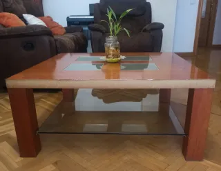 Elegante mesa de centro con superficie de cristal y estructura de madera. - Diseño moderno y funcional. - Acabado en tono madera natural. - Incorpora dos cajones para almacenamiento. Imprescindible venir a recoger en persona.
