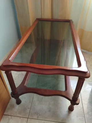Elegante mesa de centro con un diseño clásico. - Encimera de cristal. - Estructura de madera. - Patas con detalles tallados. -Con dos alturas, ideal para un salón, dejar los mandos de TV, revistas, poder comer,...