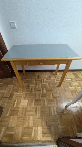 Mesa de cocina con un diseño sencillo y funcional. Ideal para el día a día. Con muy poco uso, está como nueva. - Tablero de color gris. - Patas de madera. - Cajón con tirador de 35cm - 1m de largo X 50cm de ancho y 75cm de alto.