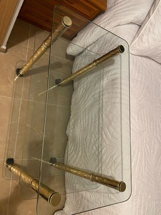 Elegante mesa de centro con diseño moderno y funcional. Combina una superficie de cristal con una base de metal. - Tablero superior de cristal. - Estructura de metal. - Bandeja inferior blanca. -Poco uso 10 eur con retiro en domicilio
