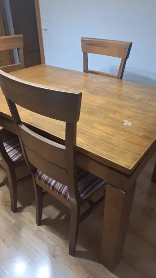 Conjunto de mesas y sillas de madera. Oportunidad por liquidación! Vendo lote de 4 mesas cuadradas (80x80 cm) y unas 20 sillas a juego en madera maciza. Conjunto muy robusto y estable, perfecto para bar, restaurante, peña o local de eventos. Tienen marcas de uso normales pero están en buen estado estructural. Urge venta por falta de espacio, de ahí el precio. Posibilidad de vender conjuntos sueltos, pero prioridad a quien se lleve el lote completo. ¡Ganga! El precio es el de 4 sillas y una mesa. Preguntar por mensaje para más