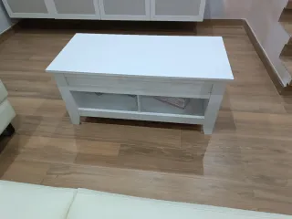 Mesa de centro con diseño moderno y funcional. - Tapa elevable para mayor comodidad. - Acabado en madera y blanco.