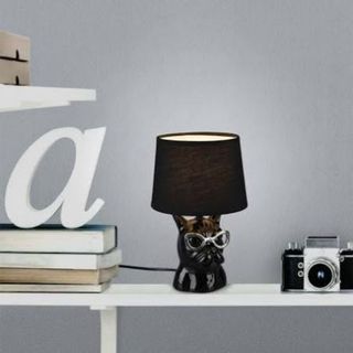 Original lámpara de mesa con un divertido diseño de perro bulldog francés con gafas. - Base de cerámica con acabado brillante. - Pantalla de tela. - Estilo moderno y llamativo.