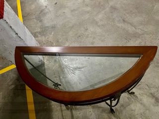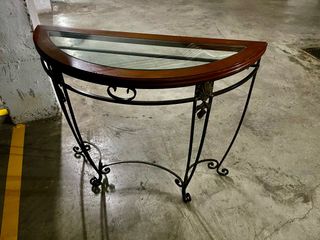 Elegante mesa consola con diseño de media luna. - Encimera de madera con borde curvo. - Estructura de forja con detalles ornamentales. - Superficie de cristal. -Tiene un micro golpe,visible en unas de las fotos. -Nunca se estreno,conserva la brida de la etiqueta sin etiqueta. -Las medidas son mas menos.