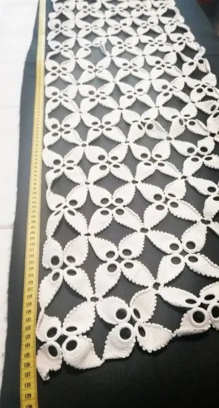 Elegante camino de mesa con un intrincado diseño floral, estilo crochet. Medidas 120 * 38 - Elaborado de alta calidad. - Patrón de flores y hojas detallado. - Borde festoneado. - Aporta un toque de sofisticación a cualquier mesa.