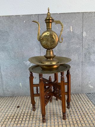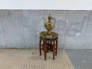 Mesa de madera de calidad con bonita bandeja troquelada de latón y tetera de latón también. La tetera y el soporte de tetera están abollados por caídas y la tapa de la tetera está suelta. La mesa y bandeja están bien. Mide todo el conjunto de altura 95 cm. La mesa se pliega para que se pueda recoger en poco espacio.