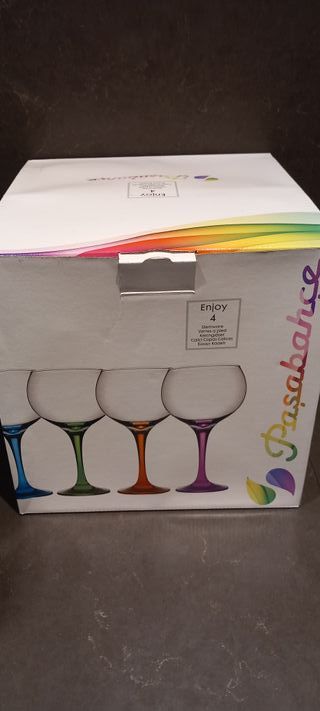 Set de 4 copas de cristal de la marca Paşabahçe, con un diseño moderno y colorido. Perfectas para añadir un toque de estilo a tu mesa. - Diseño de tallo alto. - Colores vibrantes en el tallo y la base.