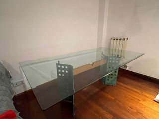 Mesa de cristal templando blanco, patas de hierro blancas. 140x90cm (no extensible). Tiene marcas de uso en las patas y el cristal