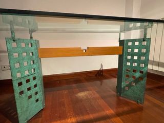 Elegante mesa con superficie de cristal y base metálica. - Diseño moderno y minimalista. - Patas con acabado enrejado.