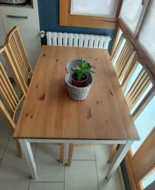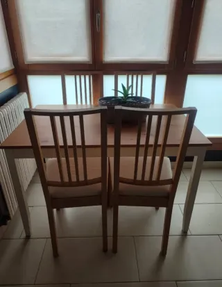 Se vende una mesa de exterior redonda de 60 cm de ancho y 76 de alto, con 2 sillas también de exterior 96 cm de alto y 46 de ancho. Se han usado poco y nunca se han mojado en la calle, solo se han usado en balcón cubierto. Se puede plegar tanto la mesa como las sillas, como se ve en una foto.